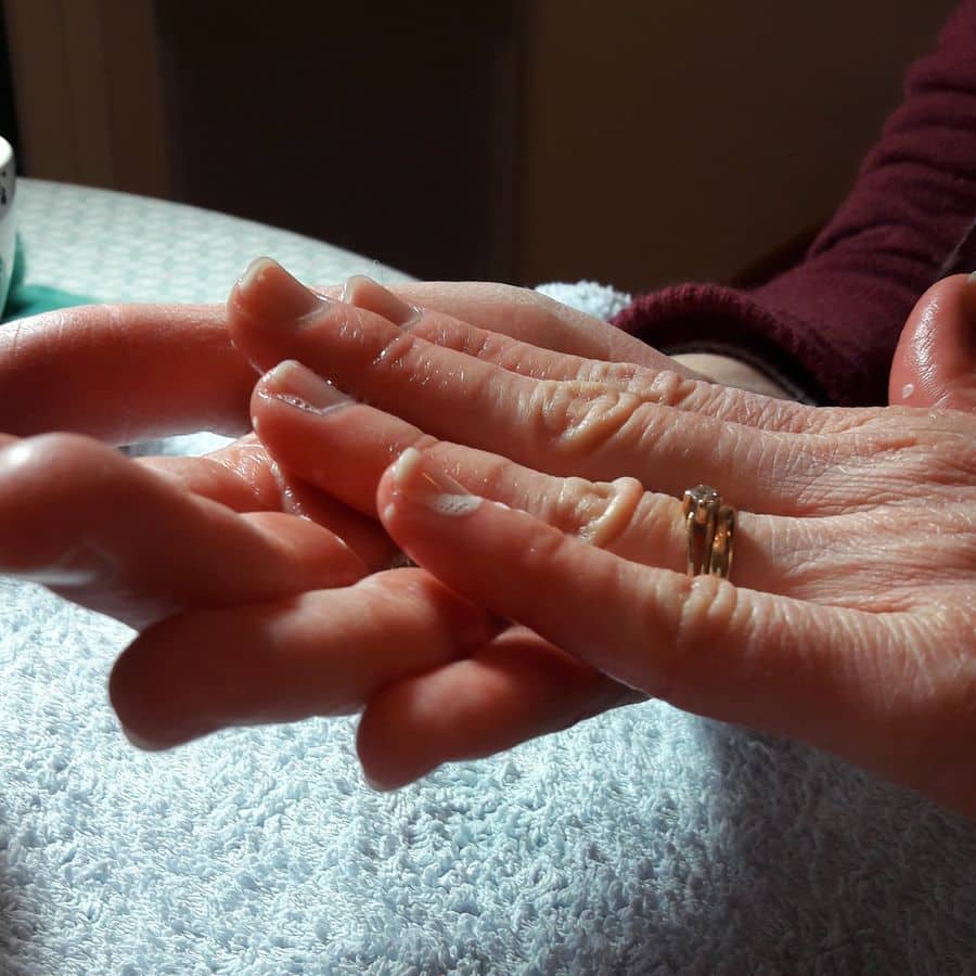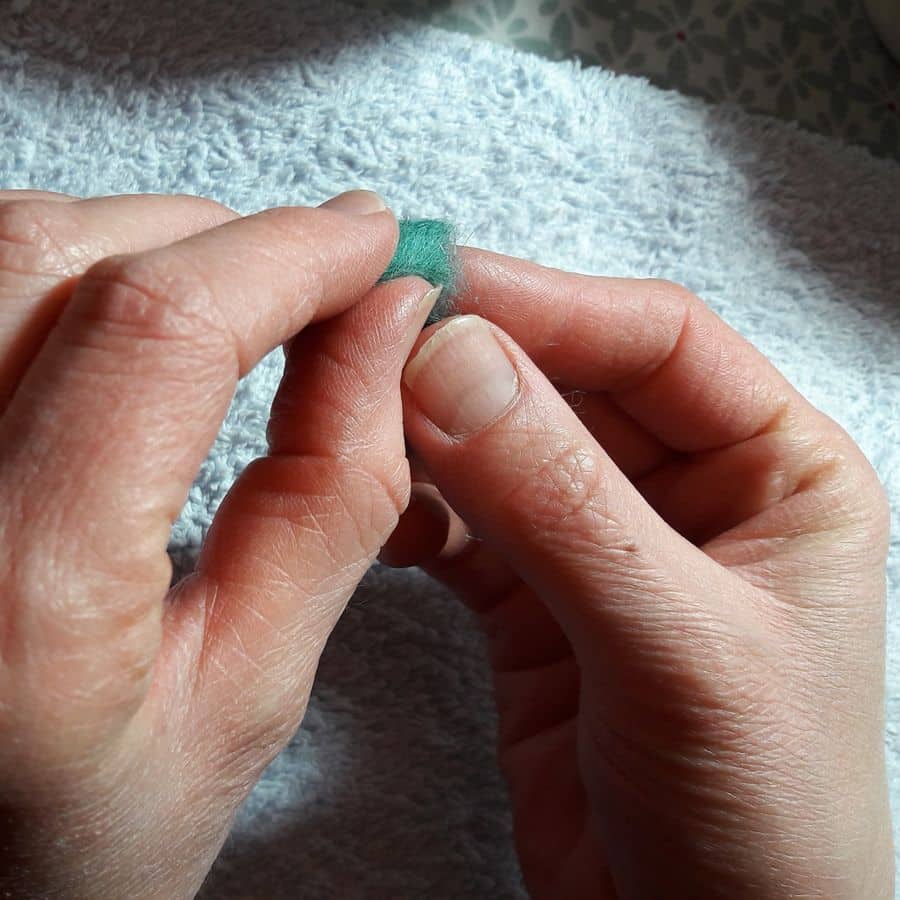 -Placez-la sur la paume d’une main et, avec l’autre main à plat, faites rouler la « boule » en appuyant très légèrement (au dessus de la serviette). Petit à petit, continuez le même geste en appuyant de plus en plus. Au fur et à mesure, on sent que la boule se forme et devient plus dense. Si besoin, on peut tremper à nouveau la boule dans l’eau savonneuse. Il faut toujours avoir un peu de savon sur les mains. Régulièrement, vérifiez (surtout au début) que la boule se forme bien, qu’il n’y a pas de creux où les fibres de la laine ne s’accrochent pas bien entre elles. Si c’est le cas, prenez soin de bien rouler la boule à cet endroit.