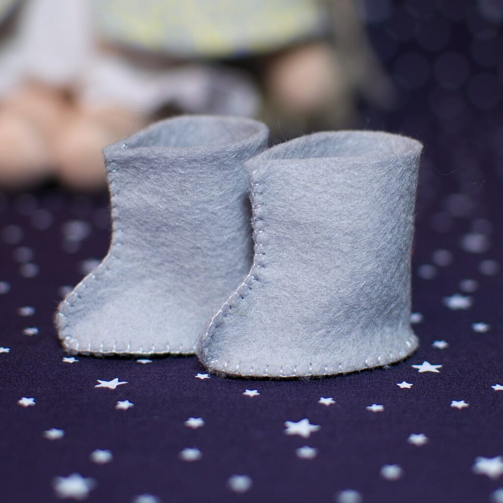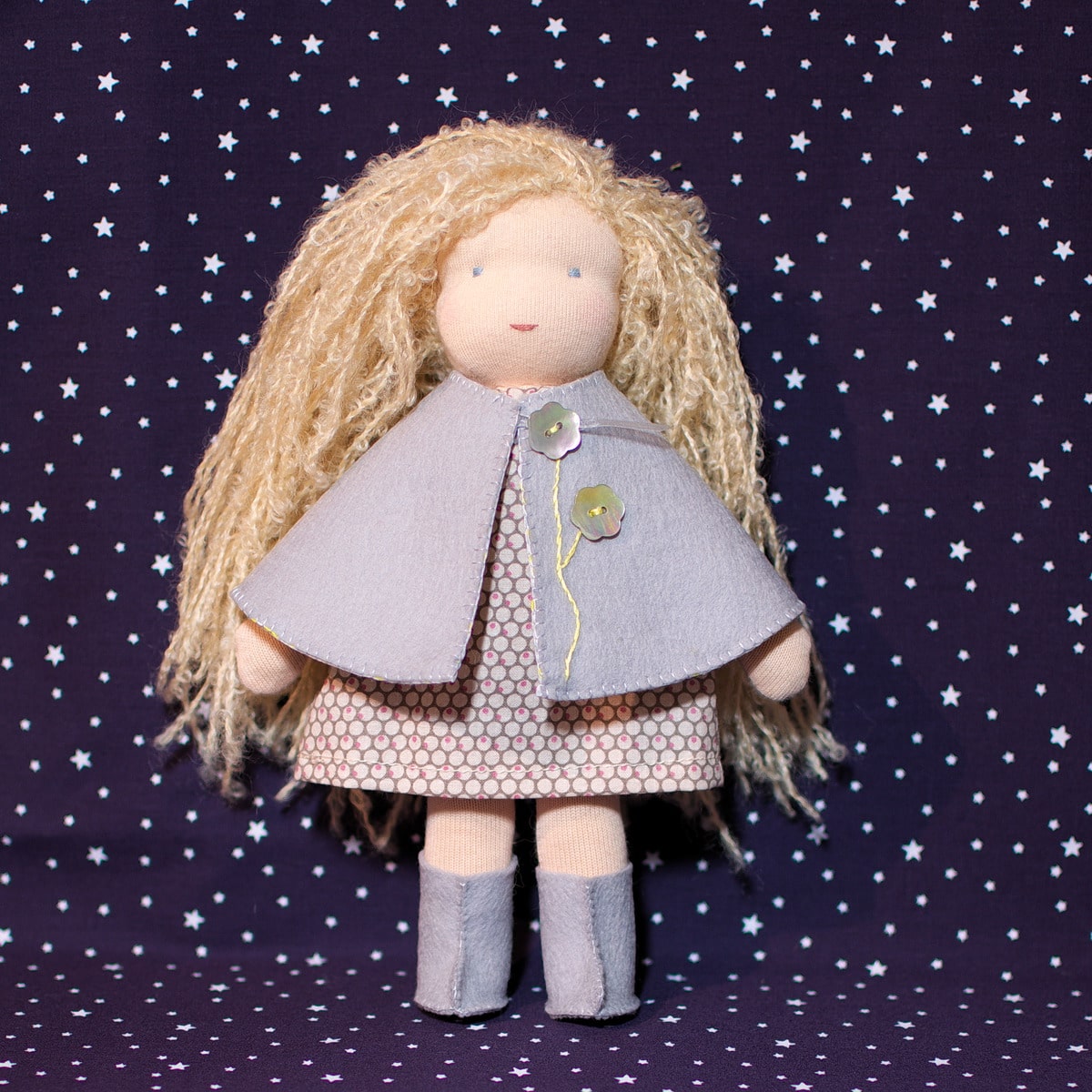 Voici une jolie cape réversible et des bottes, à réaliser à partir de feutrine de laine et de popeline, sans machine à coudre, sans difficulté, pour une poupée Pique & Colegram de 23cm. La cape peut se porter côté feutrine ou côté popeline. Elle se ferme grâce à un ruban et de jolis boutons et se pare d’une broderie sur le côté feutrine.