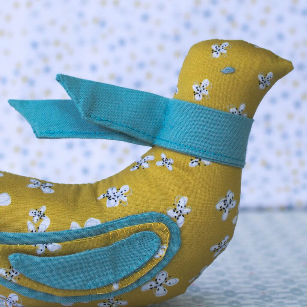 L'oiseau peut être cousu en partie à la machine, en partie à la main, ou entièrement à la main. Les yeux sont brodés à la main.