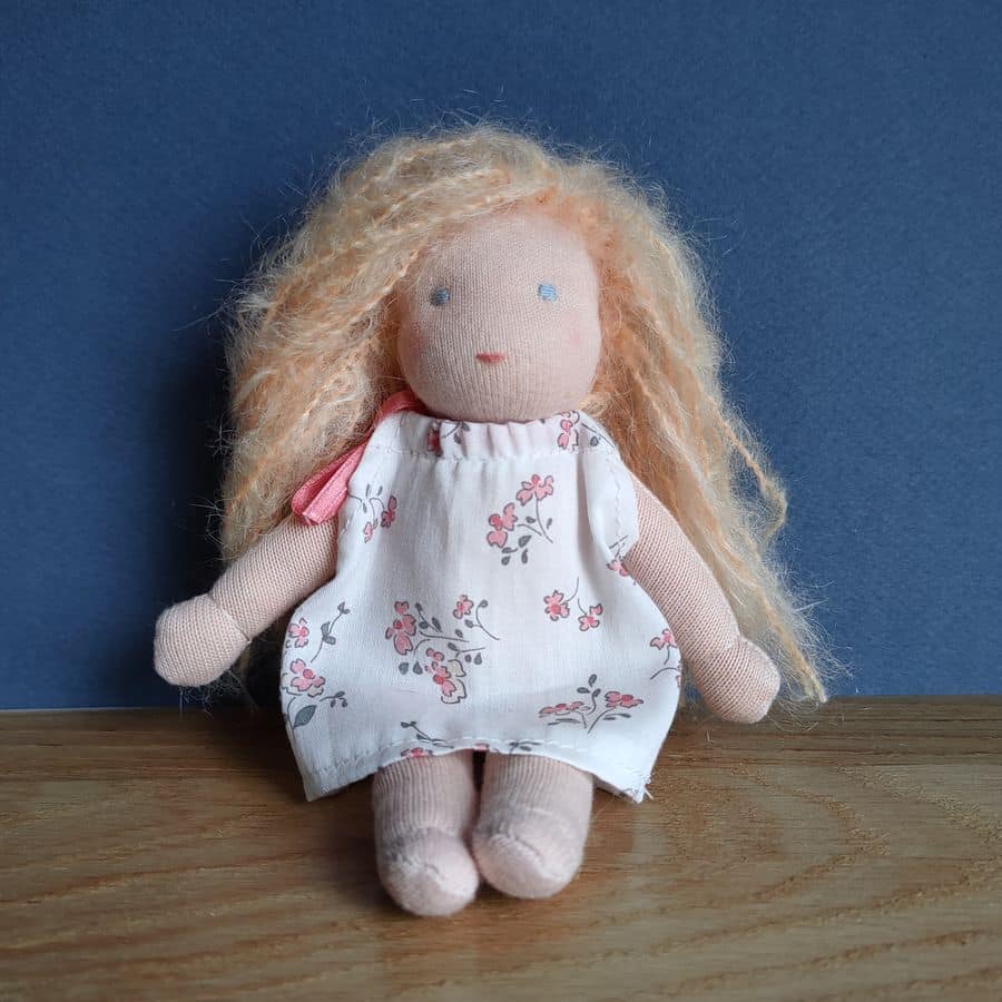 Petite Pervenche est une mini poupée de 16cm, d’inspiration Waldorf, à réaliser avec du jersey de grande qualité et de la laine cardée, certifiés oeko-tex. Ses cheveux sont confectionnés avec de la laine mohair Ombelle de Fonty, avec laquelle on réalise un petit bonnet au tricot, sur lequel on fixe des mèches.